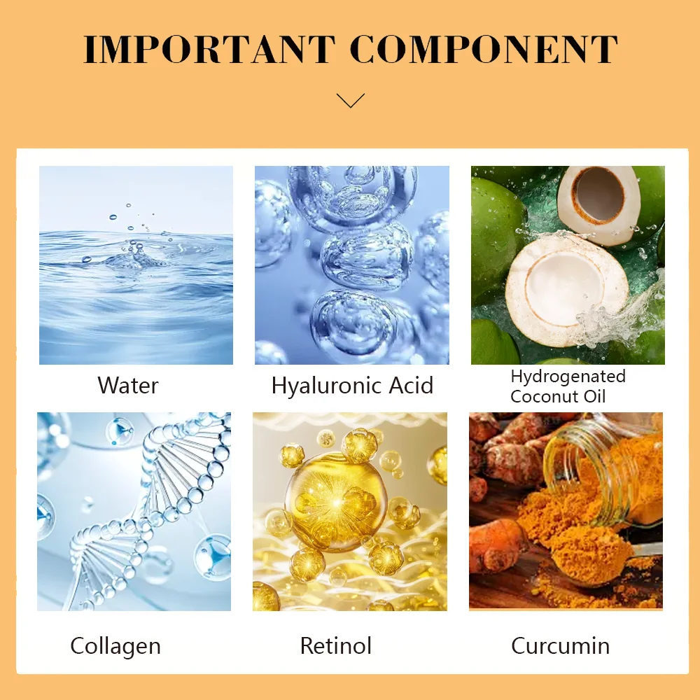 يحتوي على مكونات فعالة مثل: الماء، حمض الهيالورونيك، الكولاجين، الريتينول، والكركمين